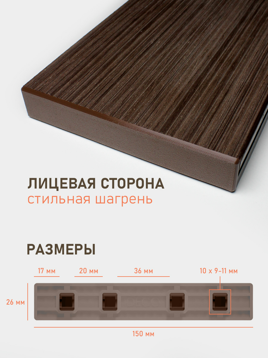 Пластиковые заглушки для террасной доски Вельвет из ДПК. Обеспечивают визуальное завершение открытых сторон и дополнительную защиту от попадания загрязнений. Размер заглушки соответствует размеру доски 150*26 мм.